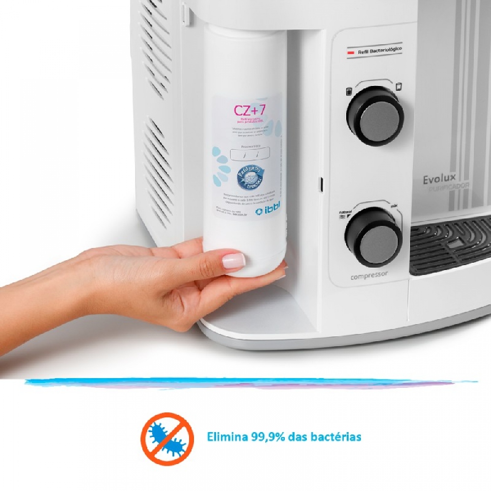 O purificador Evolux traz filtro que elimina bactérias e troca de refil inteligente com LED que avisa o momento certo da substituição. Mesmo com tamanho compacto, garante, além de água livre de bactérias, bica articulável, três opções de temperatura – natural, gelada e misturada – e economia de energia para os menores espaços, atendendo pequenas famílias e microempresas. É saúde e praticidade em cores que combinam com qualquer decoração.